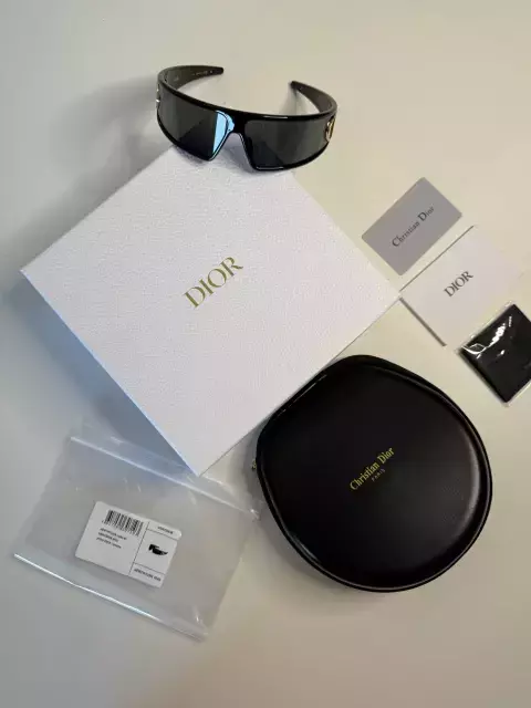 Com armação escultural em nylon preto, o modelo exibe o icônico detalhe Cannage nas hastes, assinatura “CD” em metal com acabamento dourado e lente cinza arredondada que reforça o espírito couture da peça.